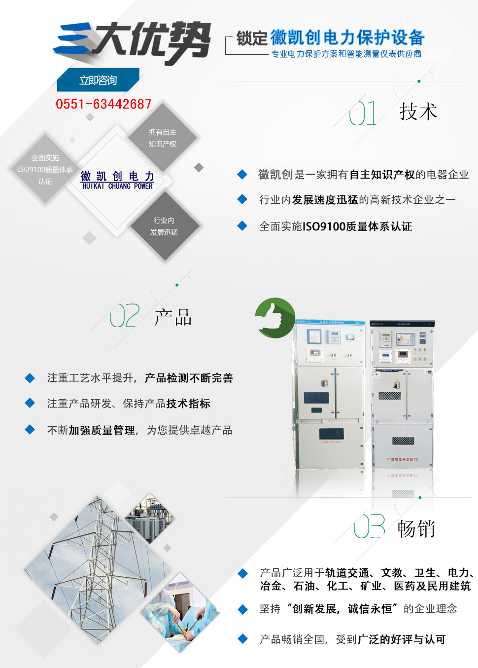 安徽徽凱創(chuàng)電力保護(hù)設(shè)備有限公司主要從事新型電氣設(shè)備、電子設(shè)備、智能控制技術(shù)的產(chǎn)品研發(fā)、生產(chǎn)、銷售。主要產(chǎn)品有:智能型消弧消諧裝置、消諧過電壓抑制柜、 組合式過電壓保護(hù)、智能型開關(guān)柜智能操控裝置、微機(jī)消諧、小電流選線、電弧光保護(hù)裝置、智能在線絕緣監(jiān)測裝置等電氣產(chǎn)品。 產(chǎn)品廣泛用于石化、煤炭、電力、建筑、市政、機(jī)場、鐵路、醫(yī)院、學(xué)校等領(lǐng)域,受到用戶一致好評。